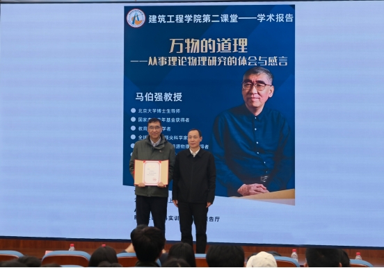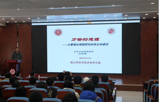本次活动分为学术讲座和学术沙龙两个环节。在学术讲座环节,马教授在工科实训中心二楼报告厅发表题为“万物的道理——从事理论物理研究的体会和感言”的演讲,并与师生进行互动。他分享了自己的科研经历,用通俗的语言阐述了人类认识微观粒子世界和宇观宇宙的历程,引导大家了解粒子物理学和宇宙学的科学成就和现状,激发了学生的科研兴趣。在学术沙龙环节,马教授与年轻教师深入探讨教学科研能力提升的问题。
