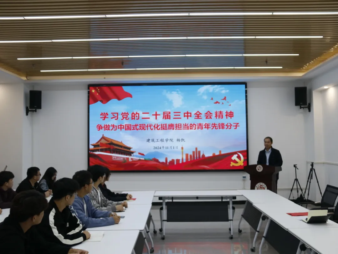 杨凯通过“青马工程”的主旨与意义引入正题,点明了“七个聚焦,六个原则”的理念,强调了要完善学生的学习实践制度,并提出,青年是国家的未来,当代青年责任重大,要求学员们珍惜时代际遇,以孜孜以求的奋斗精神,在实践中勇担重任、求真学问、练真本领,谨记习近平总书记对青年人三个“不辜负”的殷切期望,为实现中华民族伟大复兴而奋斗。杨书记鼓励建工学子多读书,多做事,有恒心,了时事,学理论,争做为中国式现代化挺膺担当的青年先锋分子。